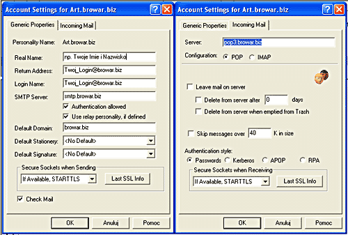 Mój program pocztowy Eudora 6.0 nie obsługuje mojego konta poczty @browar.biz. Główne konto @hot.pl jes obsługiwane bez problemów. Może to być problem konfiguracji czegoś tam, konieczność uwierzytelniania wprowadziła wiele zamieszania. Wypróbowałem wszystkie warianty konfiguracji konta, łącznie z importem, niestety nie działa.