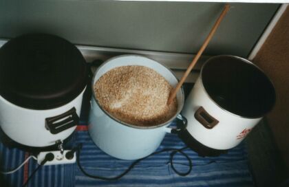 Ja warzenie piwa zaczynam od mielenia slodu. Znalazlem kiedys na strychu pewnego starego, opuszczonego domu przedwojenny mlynek do kawy, ktory pierwszorzednie sie do tego nadaje. Jest to zwykly mlynek na korbke, ktory przytwierdza sie do sciany, o duzym (1litr), porcelanowym zbiorniku. Podobne mlynki widzialem kiedys w Opolu na targowisku w cenie 60 – 100 zl. Cena waha sie w zaleznosci od humoru sprzedajacego, no i oczywiscie od tego czy uznaje on interesenta za rodaka, czy obcokrajowca. Moj mlynek na szczescie nie kosztowal nic i mielilem nim moj slod recznie z predkoscia 3 kg/h. Zmielenie 10 kg, ktore sa potrzebne do produkcji 30 – 50 litrow piwa trwalo ok. 3 – 3,5 godziny. Kiedys wreszcie zmadrzalem, odkrecilem korbke, podlaczylem wiertarke i w tej chwili na zmielenie 10 kg. Potrzebuje ok. 45 minut. Mlynek nie powinien mielic zbyt dokladnie, powinien jedynie zgniesc ziarno, a nie zmielic luski, ktora jest potrzebna przy pierwszej filtracji. Do wyprodukowania 10 l. piwa potrzebuje ok. 2 – 3 kg. slodu.