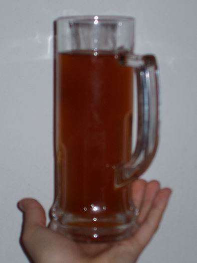 Tak mi się spodobała praca na uczelni, że postanowiłem spróbować w domciu a właściwie na razie na stancji. Zakupiłem więc konkursowe piwo „prawdziwe-ale” w Peronie nr 6 (bardzo przyjazny sprzedawca, polecam i pub wyjątkowy zapraszam), i 2003-04-03 (czwartek) gotowałem ekstrakt z chmielem. Ach co za zapach się unosił w całej stancji, niepowtarzalny miodzio. Gotowałem w garnku 12 l przez 70min. pierwsza dawka chmielu na początku a pod koniec gotowania na jakieś 5 min. dodałem jeszcze troszkę szyszek chmielowych, po zlaniu do fermentora ekstrakt wyszedł mi za duży ale dzięki szybkim obliczeniom dodałem odpowiednią ilość wody i wyszło tak jak w przepisie, czyli 12,5. Obawiając się o temp. fermentacji postanowiłem dodać dwie torebki drożdży, ale raczej to było zbyteczne. Już po kilku godzinach fermentacji wytworzyła się biała jasna piana, która po ok. 20h zbrązowiała, później przez 2 dni nie zaglądałem i w niedzielę baling wskazywał 3,5, czyli czas na zlewanie, zrobiłem sobie więc nockę i rozlałem wszystko do 34 butelek do każdej sypiąc po łyżeczce cukru. Obawiając się eksplozji sprawdzam, nagazowanie w butelkach otwierając po jednej na dzień i stwierdzam, że nie jest niebezpieczne. Piwo „ale” zdecydowanie inaczej smakuje jak piwa do, których byłem przyzwyczajony, ale jestem zawsze otwarty na nowe możliwości, jest jakiś przyjemny posmaczek, którego nie potrafię określić.