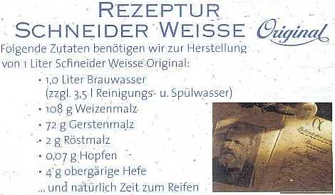 W karcie piw w knajpie firmowej Schneidera w Monachium podany jest skład Schneidera Weisse Original (scan poniżej). Nie jest to szczegółowy przepis wykonania i nie ma podanego rodzaju chmielu, choć ten chmiel w pszenicznym nie jest najważniejszy. Ilość drożdży 4g to pewnie jest zmierzona po fermentacji :wink: , bo 4g to raczej nie na 1 litr.