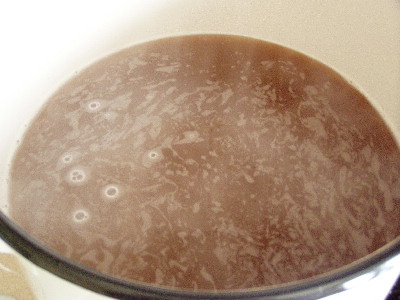 Zacieranie zacząłem od 10 minut w 55 stopniach. Potem odlałem gęstą 1/3 żeby pobawić się w dekokcję. Podgrzałem dekokt do 70 stopni i potrzymałem 15 minut, potem zagotowałem i trzymałem 10 minut. W międzyczasie podjechałem z główną częścią do 62 stopni (na 35 minut). Po wlaniu z powrotem dekoktu trzymałem całość przez godzinę w 72 stopniach i przez 10 minut w 75.