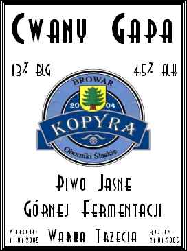 No ale postanowiłem czekać, tymczasem warka trzecia uzyskała nazwę "Cwany Gapa" i etykietę (nazwa inspirowana filmem "Co mi zrobisz, jak mnie złapiesz" o ile dobrze pamiętam). Później nie miałem okazji próbować piwka (bo Post), ale postanowiłem, ze zabiorę je na giełdę w Świdnicy, aby poznać opinie kolegów piwowarów. Jakież było moje zdziwienie