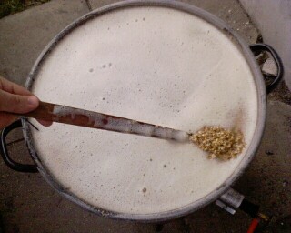 Wyszła tragiczna efektywność. Uzyskałem 46l 10blg. Jako przyczynę upatruje kompletny brak okresowego mieszania zacieru podczas zacierania. Ewentualnie zbyt grubo zesrutowany slod. Widziałem sporo ziarenek w calosci.