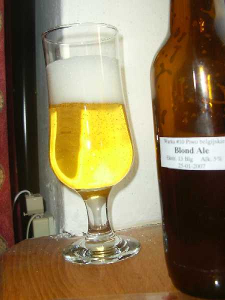 . Przyczyna: typowe błędy początkujących - niedostateczne opanowanie technologii - za słaba dezynfekcja, napowietrzanie przy przelewaniu na cichą; a przede wszystkim jak sądzę marne drożdże. Zapomnijmy o tych wprawkach, piąta warka była przełomem:Warka #5 i #7 - bliźniacze piwa, Jasne Zwykłe, proste piwko ze słodu pizneńskiego. Wyszło całkiem przyzwoite, bez błędów technicznych, ale też niespecjalnie ciekawe. O dziwo właśnie te piwa najbardziej smakują ludziom przyzwyczajonym do sklepowych lagerów. Warka #5 była chmielona na smak, #7 na aromat. Piwo jest stosunkowo słodkie, więc lepsze efekty dało chmielenie na smak, goryczka + słodycz niespecjalnie się komponują. Za to #7 ma piękny zapach chmielowy.