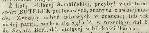 Ogłoszenie z Kur. War. 1843 Huta produkujących butelki porterowe.