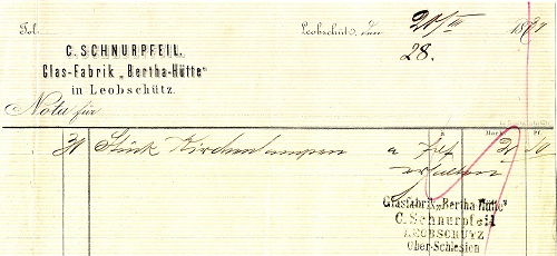„W 1856r., gdy Głubczyce zostały połączone koleją żelazną z Raciborzem, niedaleko dworca kolejowego, na parceli między dzisiejszą ul. Dworcową a ul. Lwowską, powstała huta szkła Konstantina Schnurpfeila, uruchomiona w 1857r. Około 50 pracowników produkowało tu corocznie półtora miliona butelek do piwa i wody selcerskiej, które znajdowały odbiorców w Poznańskiem, na Pomorzu Gdańskim i w Brandenburgii. W 1877r. huta przeszła w ręce syna założyciela, Eusebiusa Schnurpfeila, którego Hofrichter określa jako człowieka upartej natury, zawsze przeciwnego zarządzeniom policyjnym. 3 domy przy ul. Dworcowej postawił wbrew takim zarządzeniom ukośnie do ulicy. Pod datą 1909 dowiadujemy się, że huta szkła używała do sporządzania kotłów do wytapiania specjalnej jakości gliny, sprowadzanej z Hesji – Nassau i Bawarii i że po kilkuletnim bezruchu znów została uruchomiona. Zatrudniała rocznie ok. 40 robotników i produkowała półtora mln butelek. A. Radwan, którego rodzina do 1917r. mieszkała w budynku huty, podaje kilka szczegółów dotyczących jej wyglądu. Miała wysoki komin, 3 wymienne kotły do pieców, a do domu Eusebiusa Schnurpfeila przylegała dobudówka jako mieszkanie mistrza huty. Była tu też stajnia dla koni i mieszkanie dla ich opiekuna. Pośrodku podwórza stał dom, w którym mieszkało kilka rodzin, a bliżej stawu Łabędziego stał jeszcze jeden dom mieszkalny, który uległ rozbiórce. Przy ul. Dworcowej do 1917r. stało kilka drewnianych szop, w których na regałach stały szklane, zapakowane w słomę wyroby huty, zawożone na furmankach na przemysłowy teren Górnego Śląska. Fritz Baumgart, dawniej instruktor nauki jazdy w Głubczycach, pamiętał, że na łące, tam gdzie znajduje się wspomniany staw Łabędzi, stał maszt z żelaznej kraty z silnikiem wiatrowym, który pompował wodę dla huty. W 1903r. przewrócił go wiatr. Wg Hofrichtera, z powodu braku nowoczesnych urządzeń huta ta nie mogła sprostać konkurencji, straciła klientów i w 1910r. zakończyła swą działalność. W latach 30 teren ten przejęła cukrownia Baborów w celu zbiórki buraków cukrowych. W głubczyckim muzeum był kącik poświęcony tej hucie.”