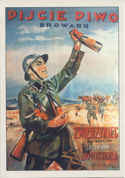 "...Plakat, reklamujący zwierzynieckie piwo, namalowany przez Wojciecha Kossaka, jest jedynym z nielicznych dzieł malarza, poświęconym Zamojszczyźnie. Do powstania plakatu doszło w niecodziennych okolicznościach w 1929 r. Wojciech Kossak przebywał wówczas za granicą, a do Polski przyjechał tylko na krótko, prawdopodobnie w sierpniu. Odwiedzając Warszawę, zaprosił przyjaciół do znanej kawiarni "Ziemiańska". Biesiada trwała długo, wypito dużo trunków i okazało się, że Kossakowi zabrakło pieniędzy na zapłacenie rachunku. Wtedy przyszedł mu z pomocą obecny na przyjęciu ordynat Maurycy Zamoyski. Zapłacił za malarza, a ten zaproponował mu w zamian wykonanie plakatu, reklamującego piwo z ordynackiego browaru w Zwierzyńcu (....) W tym czasie w okolicy Zwierzyńca odbywały się manewry 9 pp. Leg. z Zamościa. To zapewne dlatego na plakacie pojawił się żołnierz z karabinem i butelką piwa zwierzynieckiego w lewj ręce, a w tle obrazu znajdują się sylwetki żołnierzy i wojskowych koni. (....) Jest też prawdopodobne, że Kossak wykonał plakat dla browaru w Żywcu, z którego właścicielami, książętami Habsburgami, znał się dobrze. Wykonana przez mistrza kolorowana litografia, umieszczona w oszklonej ramce, wisiała w browarze do czasów wojny. Obecnie istnieje kilka kopii plakatu, m.in. w browarze w Zwierzyńcu i Muzeum Zamojskim (...)".