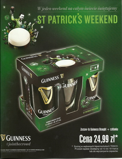 Na początku marca w sieci TESCO pojawi się limitowany zestaw piwa GUINNESS 4X440ml + SZKLANKA. Cena zestawu to 24,99. Całość spakowana w zielony pack utrzymany w konwencji zbliżającego się dnia Świętego Patryka.Comment