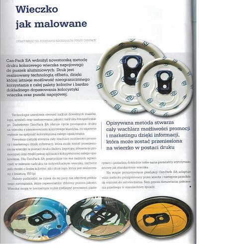 Jestem tutaj nowy ale myślę, że zaciekawi was coś na co trafiłem na targach w Poznaniu. Mianowicie wpadła mi do rąk gazeta "Opakowanie". Wewnątrz natrafiłem na artykuł, w którym podana jest informacja, że producent puszek i wieczek do piwa opracował technologię wytwarzana malowanych wieczek do piwa. Myślicie, że to się przyjmie ? Jeśli tak to będzie co kolekcjonować. Jako załącznik skan z tej gazety.