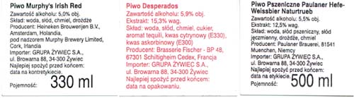 Wydaje mi sie że eta z postu 27 (z czeskiego browaru Kutna Hora) to nie etykieta głowna tylko rodzaj krawatki albo klasyczna na szyjkę butelki albo naklejanej prawdopodobnie na kabłąk drucianego zamknięcia butelki - wyglada na starą , mniejwięcej odpowiednik naszych PPFów. Nie ma na niej nazwy , typu piwa wiec nie wydaje mi sie być "samodzielną" etykietą.Piętnastego czerwca roku dwa tysiące czwartego zbóje z bandy Heńka zamkły "Królewskiego" !!!