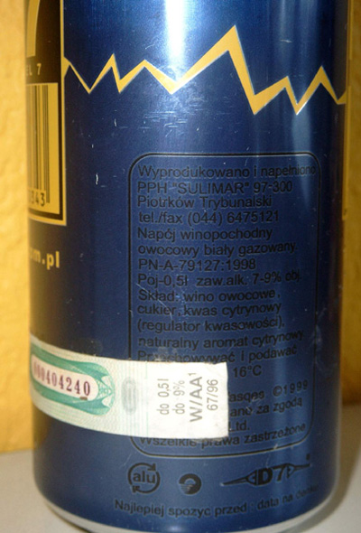 Witam, po długiej przerwie wracam do tematu D7 - wino czy piwo? Znalazłem puszkę od owego trunku i wg mnie, jak pisałem wcześniej było to wino, a konkretnie "napój winopochodny owocowy, biały gazowany" jak głosi opis na puszce. Była też naklejona akcyza, jak wcześniej pisałem. Może późnie były inne wersje tej puszki, ale tą o której pisałem zamieszczam na zdjęciach.