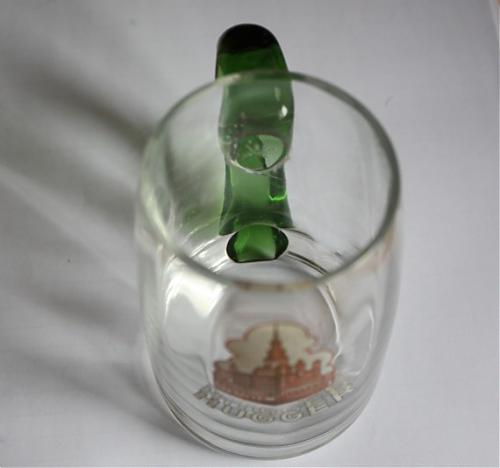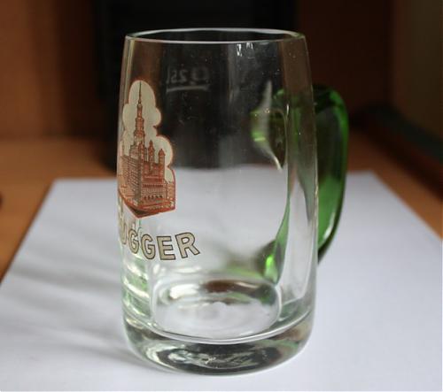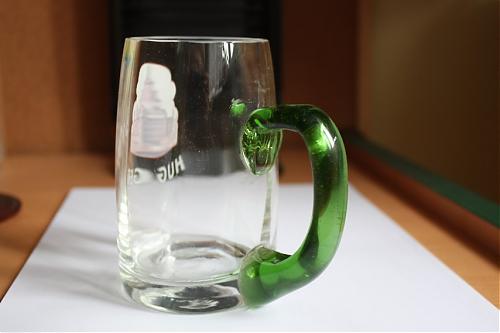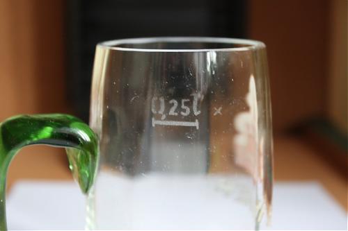 Taki kufel wpadł w moje ręce. Wykonany z grubego szkła z metalowym zamknięciem. Ma wygrawerowaną sygnaturę 0,4 L. Napisy jak widać na zdjęciach.