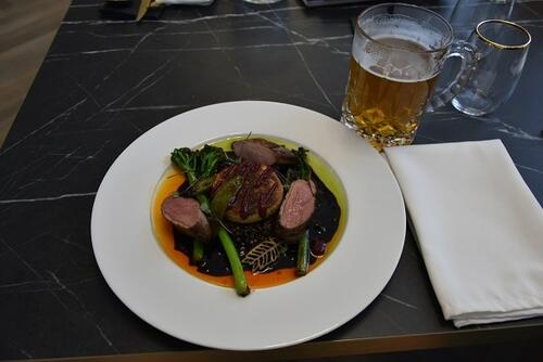 Ja zamówiłem pierś z kaczki z czarną i zieloną soczewicą, brokułami, drożdżowymi racuchami "crumpets", żelem z owoców leśnych i sosem demi-glace z malinami i jeżynami.