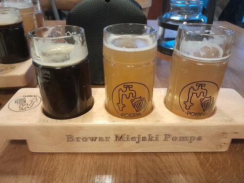 W ostatni weekend w Rumii otworzył podwoje Browar Miejski Pompa. Budynek podobno dawnej przepompowni znajduje się niecałe 10 minut spacerkiem od stacji kolejowej. Na środku lokalu jest szyba w podłodze z widokiem na fermentory. Aktualnie są cztery piwa: pils, lager, pszeniczne i ciemne (podobno koźlak). Można zamówić deseczkę, ale ta ma tylko 3 gniazda na pszenicę, ciemne i do wyboru trzecie. Piwom daleko do tego, aby powiedzieć, że są smaczne. Czegoś wszystkim brakuje, stąd moja uwaga przy ciemnym. Takie nazwy są w menu, gdzie brak ekstraktu, alkoholu jest za to do jakich potraw pasują. Piw na wynos na razie nie ma. Nie ma też podstawek, wizytówek. Logo jest tylko na kufelkach 0,125 ml. Pozostałe szkła czyste. Pszenica w grubym kuflu trochę nie pasuje w tego typu lokalu. Mam nadzieję, że się jeszcze wyrobią.
