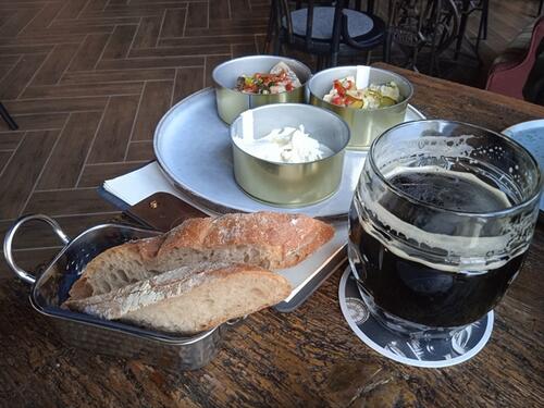 Na stół wjechała miska sardynek smażonych za 29 zł (wyśmienite, warte swojej ceny w smaku i gramaturze), pizza Cotto za 38 zł (na zdjęciu z piwem Lager) oraz śledzie na 3 sposoby za 39 zł podane w bardzo pomysłowy sposób w puszkach (na zdjęciu z piwem ciemnym).