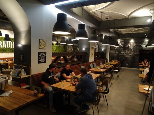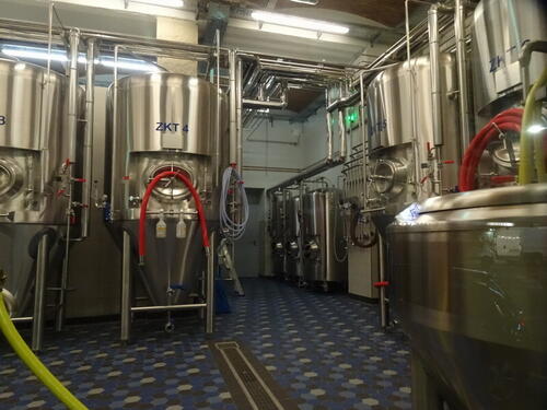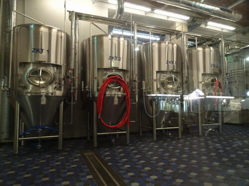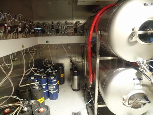 Jak wspomniałem warzelnia znajduje się w prawej części piwiarni. Kelner nie znał jej wybicia (sądzę że 10 hl lub trochę więcej), a pora była zbyt późna by zastać piwowara. Natomiast leżakownia mieści się sporo dalej, po drugiej stronie bramy wjazdowej na podwórze budynku. Tankofermentory (6 sztuk, prawdopodobnie 20 hl) i tanki leżakowe (3 sztuki) są widoczne z ulicy poprzez witrynę. Tu znajduje się również mała piwiarnia i salka konferencyjna dla grup zwiedzających browar lub odbywających kursy sensoryczne. Na drugi dzień około godziny 10 podjechałem tutaj znów mając nadzieję na spotkanie piwowara, jednak wszystko było zamknięte, a pani w recepcji po wykonanym telefonie z zapytaniem o jego ewentualną obecność, poinformowała że dziś go nie zastanę.