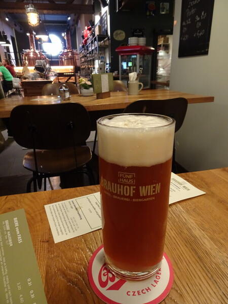 - Wiener Lager, 12,2°, 5,2%. Cena j.w. Ciemno-bursztynowe idące w brąz, mocno mętne, piana beżowa, dość mocna. Mocna słodowość i w aromacie i w smaku o trochę ciastkowo-tostowym charakterze, lekki karmel. W tle lekka nuta kwiatowa, goryczki praktycznie nie ma. Piwo mocno treściwe, do "krojenia nożem", można się najeść