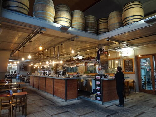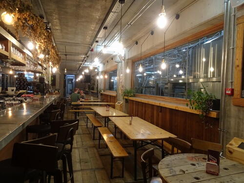 na niemal nieograniczoną obserwację całej technologii. Miejsca dla gości jest bardzo dużo. Wewnątrz po obu stronach długiego baru i wzdłuż otwartej kuchni, a dodatkowo na zewnątrz w letnim ogródku pod firmowymi parasolami. Jest przyjemnie i swojsko choć nie silono się na jakieś ekstrawagancje - tak wewnątrz jak i w ogródku podstawą wyposażenia są proste drewniane składane stoły i ławki, szpule po kablach i stare beczki, klasyczne stoły są nieliczne. Ściany betonowo szare, podłoga z kamiennych płytek bądź zwykłych desek. Oświetlenie w postaci zwisających na kablach gołych żarówek ale dość gęsto, więc nie ma półmroku i jest jasno. Na barze dwie kolumny po 5 kranów ale piw było 9, jeden kran zajmował holenderski cydr. Piwa podawane są na bar poprzez tablicę przepływu na hali produkcyjnej, widocznej za szybą. Część bezpośrednio z tanków, część z kegów. Nad barem można podziwiać podwieszoną długą półkę z kolekcją butelek po piwie. Na antresoli (tego dnia zamkniętej) widać było 200 litrowe drewniane beczki, lecz ciężko stwierdzić czy puste czy zalane piwem.