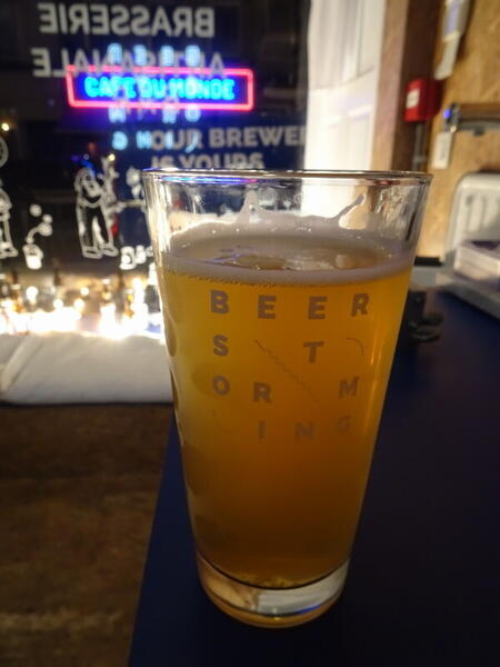 . Wszędzie jest w górę lub w dół i to pod dość słusznym kątem. Gdzieniegdzie jest też miejsce na małe skwerki pełne zieleni. A wszędzie pełno knajpek i barów z kilkoma małymi stolikami na chodnikach. Są one pełne głośno rozmawiającej i śmiejącej się miejscowej klienteli.W takim to miejscu znajduje się również browarek Beerstorming. Firmowe barwy to biały z ciemnoniebieskim i taka jest też fasada, a przed nią parkuje firmowa furgonetka i jakieś malutkie elektryczne jednoosobowe toczydełko. Do wejścia zachęca tablica - potykacz z wypisanymi dostępnymi piwami. A w środku maleńkie pomieszczenie z raptem dwoma 4-osobowymi stolikami również w firmowych barwach. Króluje płyta paździerzowa - podłoga, bar, ściany, półki na szklanki i butelki, dodatkowe siedziska w witrynie i pod ścianą (są poduszki by nie było twardo) - wszystko wykonane z tego materiału