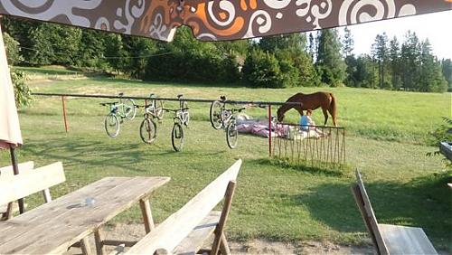 Sielska atmosfera przyciąga rowerzystów, piechurów, zarówno tych z psami jaki i np. z koniem. Dokładnie tak. Jedna pani przyszła ( nie przyjechała) sobie na piwo z koniem. Napoiła go w korytku przy basenie, a sobie zamówiła piwo. Ona rozsiadła się na pufach, a koń obok niej wtranżalał trawę na łące przy lokalu. Całe Czechy