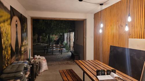 Wyszynk jest na podwórku w przyjemnym ogródku wśród drzew. Siedzieliśmy pod śliwką, która pięknie obrodziła.