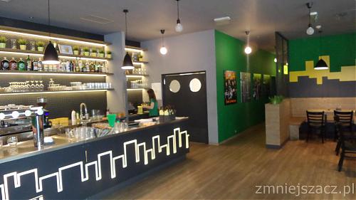 Wystrój tak baru jak i restauracji jest taki sam - prosty ale przyjemny i nowoczesny. Ściany w kombinacji ciemnej zieleni i żółtego, w wyposażeniu króluje jasne drewno, taka jest podłoga, ławy wzdłuż ścian i stoły. Krzesła i małe stoliki do picia na stojąco są czarne, także i bar, na którym umieszczono biały piktogram (taki jak w logo browaru) odzwierciedlający wielkomiejską zabudowę. Oświetlenie punktowe w postaci zwisających nad stołami lamp.