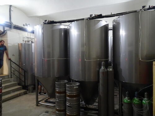 by na spokojnie w niedzielę bez tłumów móc zobaczyć cały browar w Malešově. Sládek zapewnił, że będzie na miejscu i wszystko nam pokaże. Choć akurat zniknął gdy się pojawiliśmy, to poinformował swego młodego pomocnika, że będzie taka zainteresowana grupka, więc on nas zabrał do dość głębokiej, łukowo sklepionej piwnicy. Jak się okazało, jest to piwnica z 16 wieku gdyż już wtedy istniał tu browar zaopatrujący pobliski zamek a właściwie twierdzę. Obecnie w dwóch pomieszczeniach piwnicy mieści się w sumie 9 tankofermentorów o pojemności 20 hl i 2 po 10 hl, każdy nazwany męskim lub żeńskim imieniem. Poza tym znajdują się tu również 2 zbiorniki gorącej i zimnej wody, jako że na górze przy warzelni nie było już na nie miejsca. Tu na dole miejsce jeszcze jest na kolejne tanki, jeśli by się miały pojawić to prawdopodobnie będą to leżakowe. Obecna zdolność produkcyjna browaru to około 1500 hl rocznie.