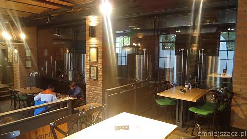 Zaraz przy wejściu do lokalu, po prawej stronie za dużym szkleniem są widoczne trzy poziome tanki. Z nich piwko wędruje do kufla.