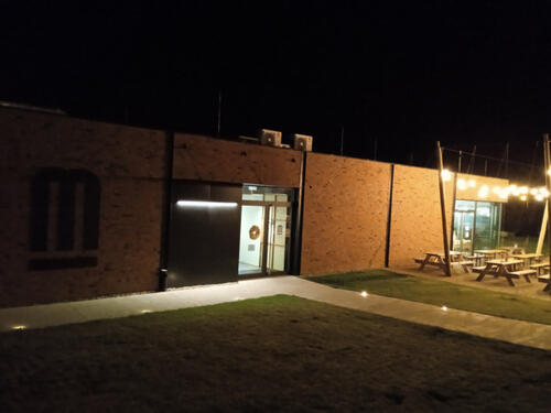 Na zewnątrz dla gości sporych rozmiarów ogródek udekorowany słupami i nitkami, imitującymi plantację chmielu, na których rozwieszono żarówki.