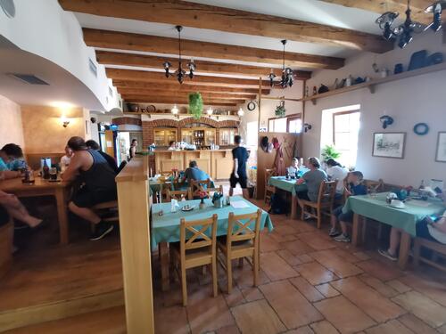 Krótka, piesza wycieczka wzdłuż brzegu Bečvou i już jesteśmy na miejscu. Lokal tuż przy głównej, prowadzącej do zamku ulicy. Na szczęście nie jest to bardzo uczęszczany szlak, natomiast w porze obiadowej jest tam tłoczno i robi się ciasno.