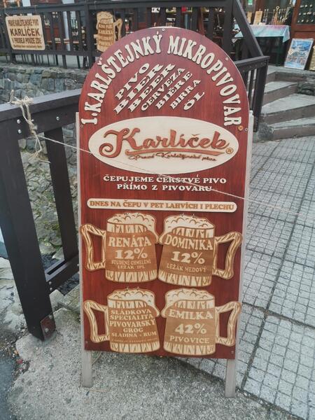 Karlštejn to jeden z najbardziej znanych i odwiedzanych przez turystów zamków w Czechach. Podążają oni ku niemu w górę wzdłuż Budňanského potoku jedyną główną ulicą miasteczka pełną knajpek, restauracji i sklepików z pamiątkami. W jednym z nich w połowie 2020 roku oficjalnie zaczął działać malutki browar, którego właścicielem i sládkem jest pan Jiří Chyba. Przez telefon powiedział mi, że nie zawsze ma piwo ale zazwyczaj otwiera sklep około południa. Byliśmy w Karlštejně w niedzielę 19.06.2022 przed godziną 13 i niestety było zamknięte na głucho. Wyglądało na to, że obejdziemy się smakiem, no ale w planie była wycieczka na zamek potem obiad po drodze, więc trochę nam się zeszło. Wracając w stronę stacji kolejowej z radością zobaczyliśmy otwarte drewniane wrota, a przed nimi gościa przy stoliku z kuflem w ręku