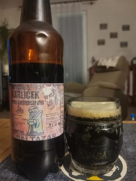 ). Piwo nie jest słodkie, bardziej jak razowy chleb ze śliwką, miód słabo wyczuwalny, podobno ciemny. "- Nie było go dużo ale gdybym go nie dodał wyczuli byście różnicę"- powiedział. Tu chmielone było ŽPČ, a pomimo ciemnej barwy nie był dodawany słód karmelowy. Bardzo smaczne, treściwe, "misiowate" piwo starej szkoły ale na końcu łyka nie brakuje goryczki.Piwa są w cenie 50 kč, na miejscu nalewane do firmowych, grawerowanych kufli z wizerunkiem karštejnskiego zamku. Można też kupić na wynos w PET-ach 1 i 2 l.