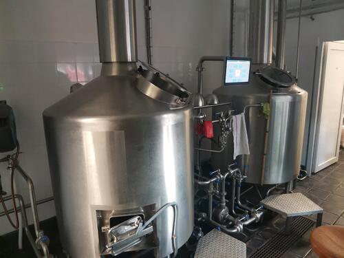 . Natomiast my zasiedliśmy w ładnej sali restauracyjnej. Tuż obok wyjścia na ogródek jest okno, przez które można zobaczyć jedno z trzech browarnianych pomieszczeń, a dokładnie widzimy tanki.Dzięki uprzejmości pomocnika sladka mieliśmy okazję zobaczyć browar również od środka. W jego skład wchodzi 500 litrowa warna, oraz 9 1000 litrowych tanków.