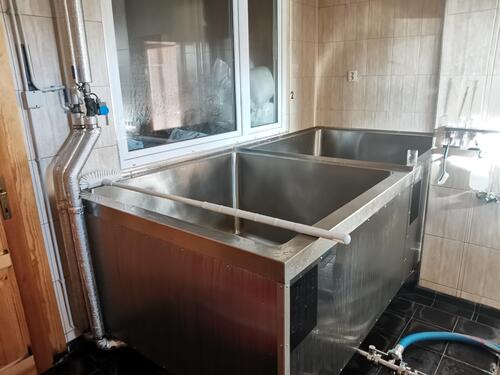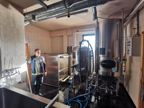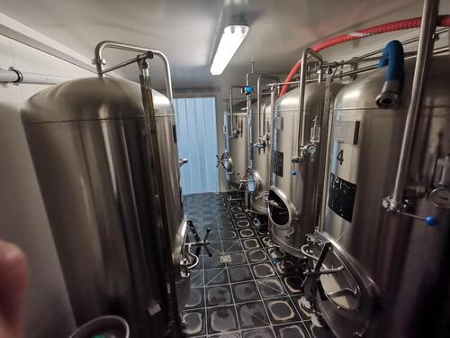 W następnym pomieszczeniu stoją dwie otwarte kadzie ( 1000 l.) zbiornik na wodę, oraz dwa tankofermentatory. Pozostała część browaru znajduje się w piwnicy 4 x 500 l. i 4 x 1000 l.
