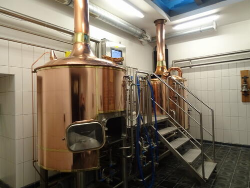 Przybyliśmy do Domažlic 29.04.2023 spontaniczną decyzją spowodowaną kłopotami komunikacyjnymi w dostaniu się do zaplanowanego browaru Drahouš. Jako, że był weekend nie liczyliśmy na spotkanie sládka i rzeczywiście nikt tego dnia w browarze nie pracował. Jedna z kelnerek pozwoliła nam zajrzeć do pomieszczenia warzelni, nie wiedziała jednak nic konkretnego. Na oko można oszacować wybicie na 10 hl. Zaskoczyła nas natomiast duża liczba tanków leżakowych i tankofermentorów (chyba ze 30), jest też okrągła kadź otwartej fermentacji. Znajdują się one w obszernej sklepionej piwnicy ze stalowymi kolumnami ale już w innej, niższej części słodowni niż warzelnia. Niestety, panował tam półmrok, nie wiedzieliśmy gdzie się włącza światło więc dokładnie nie dało się obejrzeć sprzętu.