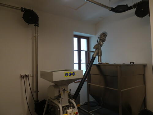 Przez ścianę z warzelnią znajduje się pomieszczenie ze śrutownikiem i zbiornikiem na rozdrobniony słód. Worków dźwigać nie trzeba - tak słód z magazynu jak i śruta do kotła są podawane przekaźnikami. Podstawowo stosuje się słody ze słodowni Klusáček z Kounic, a jako specjalne niemieckie Weyermann.