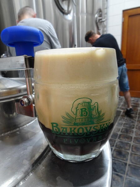 - Bakovský ležák 12°, 4,9%, 43 kč. Ciemnozłote, lekko mętne. Wyraźniej słodowe, smakowo podchodzi pod marcowe, choć jest też nuta kwiatowa. Oprócz słodu pleňského użyto monachijskiego i jak powiedział pan Daniel "garść karmelowego". Chmiele to oczywiście Žatecký poloraný červeňák, Premiant ale też Kazbek. Goryczka nie tak intensywna, pojawia się na podniebieniu po przełknięciu. Solidna klasyka.