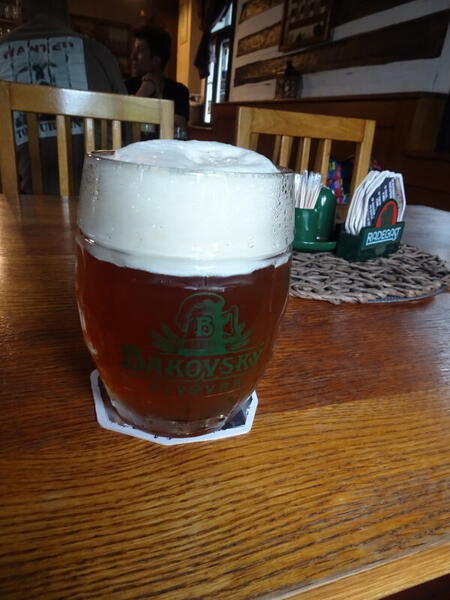 - Bakovský ležák 11°, 4,3%, 43 kč. Złote, mętne, piana z "czapką" nad kuflem. Klasyczna 11° na plzeňským słodzie i chmielach žateckých (Poloraný červeňák, Premiant, Sládek). Nic dodać, nic ująć - słodowa chlebowość, wyraźna chmielowa goryczka czyli idealnie zbalansowane czeskie dobre piwo.