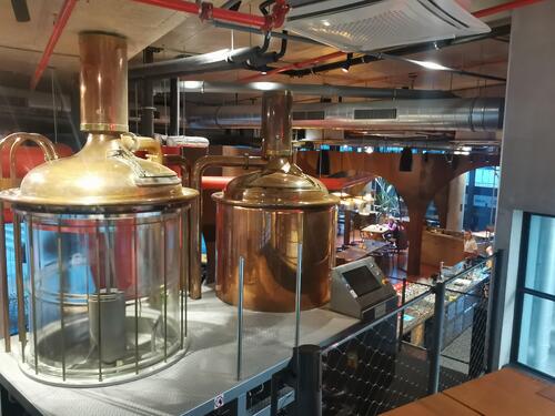 Natomiast browar to dwu piętrowa restauracja, oraz podziemia gdzie znajduje się instalacja, a piwo przy pomocy azotu na krany tłoczone jest aż 15 metrów. Nawet na kranach mają specjalne liczniki monitorujące przepływ piwa.