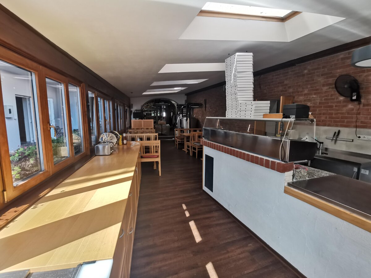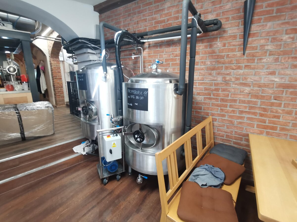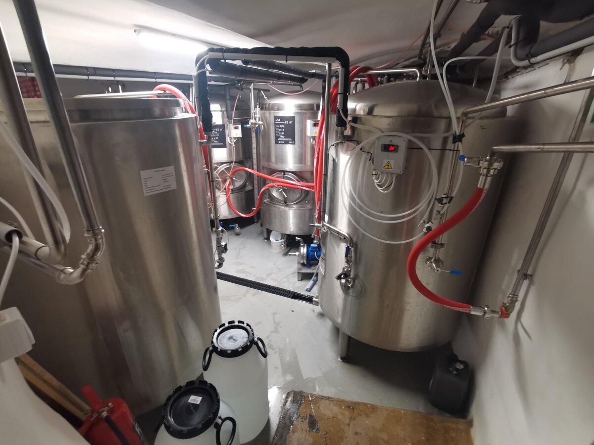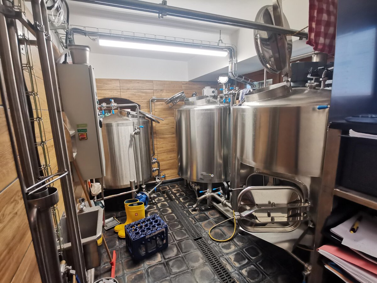 Oczywiście jest też sala barowa, gdzie na końcu stoi kamienny piec do pizzy, nad barem zamontowano tanki wyszynkowe, a obok ustawiono dwa (500l.) leżakowe. Pozostałe 5 x 1000 ustawiono w małej piwnicy z wejściem przy barze, a 500 litrowa warzelnia stoi w osobnym pomieszczeniu poza salą barową.