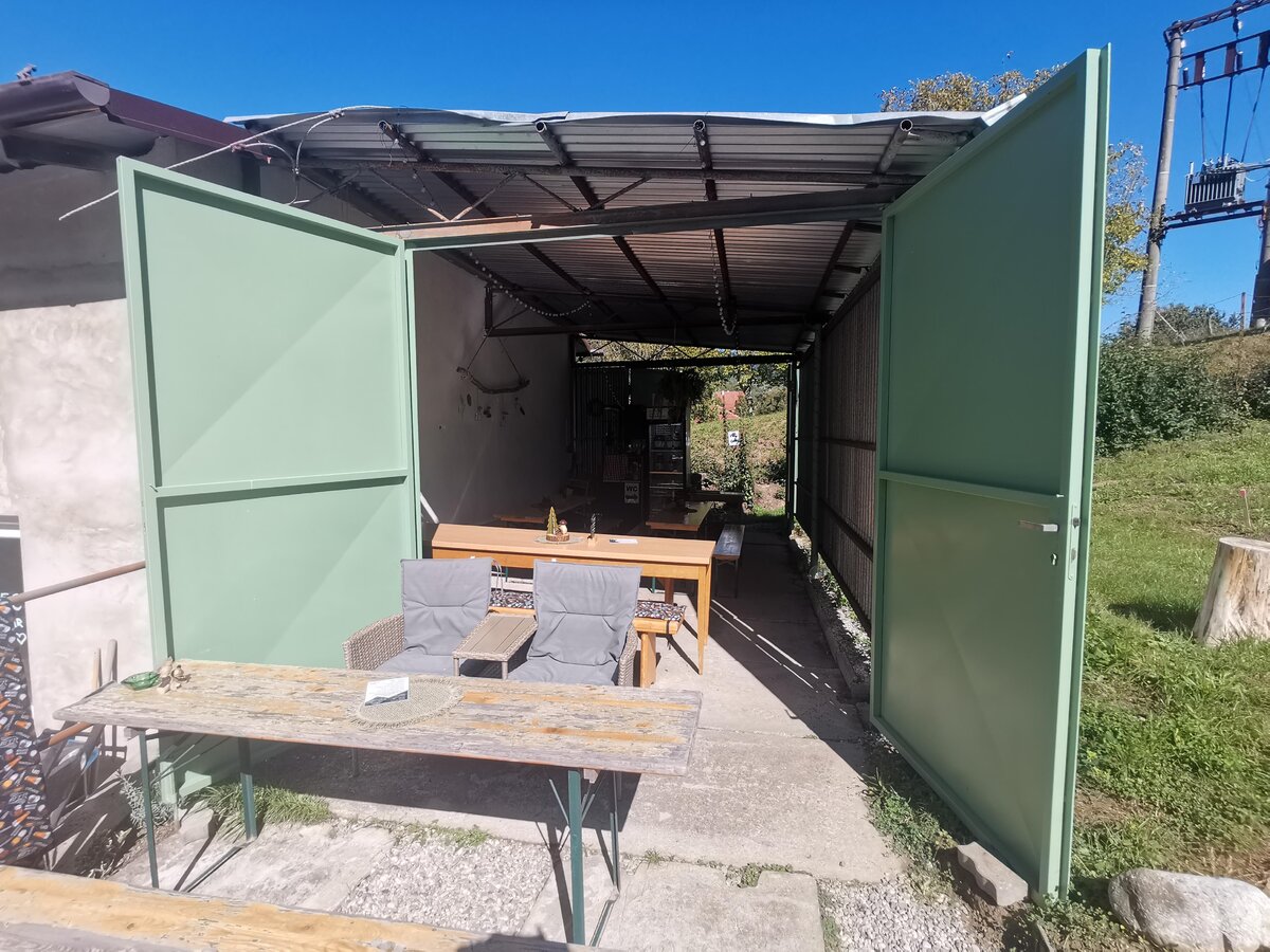 Pod zadaszoną wiatą, ustawiono trzy stoły, a przed nią kolejne dwa. Trochę wygląda to jak wielki garaż, ale jest schludnie, na głowę deszcz nie kapie, a w upał słońce w głowę nie świeci. Na sezon zimowy będzie otwarta sala barowa, która póki co jest jeszcze dużym, pustym pomieszczeniem z kafelkami na podłodze