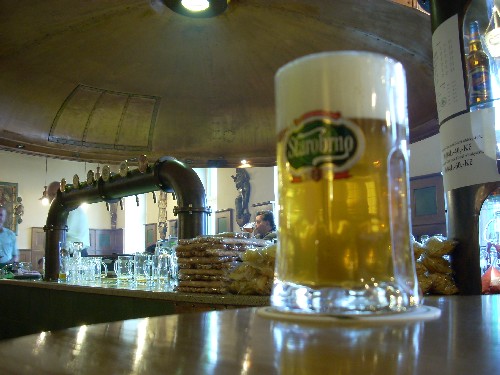 browar z zewnątrz jest całkiem świeżo odnowiony, ma duży taras z ogródkiem piwnym, który otwiera się ok godz. 12.00. dach budki w której można zamówić piwo (StaroBrno oczywiście) stanowi stary miedziany kocioł warzelny.