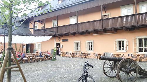 Svatováclavské slavnosti piva stały się okazją do podjęcia próby zobaczenia browaru. W sumie to browar na swojej stronie informował o możliwości zobaczenie browaru, ale jak się okazało, to wpis na stronie pozostał tylko sloganem reklamowym, a w rzeczywistości nikt o tym nic nie wiedział i nie miał na to czasu. Po godzinie 12 w celu zobaczenia pokazu walk rycerskich udaliśmy się na dziedziniec zamkowy (browarniany) i zajęliśmy miejsce przy jednym ze stolików stojących pod budynkiem browaru.