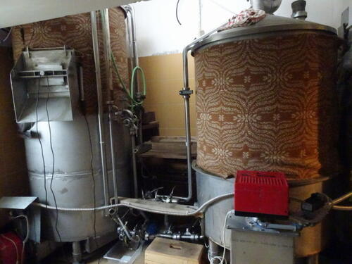 Pan Pavel powitał nas wraz z żoną, która jednak za chwilkę oddaliła się do mieszkania, my zaś z nim weszliśmy na dół do browarku. Sympatyczny człowiek, jakby trochę się krępował pokazując nam sprzęt, który sam zbudował. "- To nic specjalnego, na początku od 2002 roku miało to być tylko na domowy użytek i dla mnie i przyjaciół, potem ciągle powiększałem aż w 2010 oficjalnie zarejestrowałem". Rzeczywiście, widać było powiększanie zbiorników przez dospawy. "- I tak już od 11 lat praktycznie ciągle warzę zamiast wypoczywać na emeryturze" - z uśmiechem mówi pan Pavel. "- No ale z drugiej strony skoro moje piwa ludziom smakują to nie mogę ich zawieść. Bo jak by to wyglądało gdyby przyszli do hospody a mojego piwa by zabrakło?". Wciąż współpracuje z hostincem U kohouta, piwa są też dostępne w pivotece Stromovka (ul. Ve Stromovce 12). Jak powiedział rocznie warzy 300 hl piwa. I tak zostanie bo warzelni o wybiciu 600 l (ogrzewana gazem ziemnym) nie da się już powiększyć, brak jest też miejsca na więcej niż 5 obecnie posiadanych tanków. Warzy głównie (bo 60-70% produkcji) "mocną" 10° Kohout (właściwy ekstrakt to 10,5-10,8° Blg), trochę mniej Kluka 12°, przeważnie 2 razy do roku na święta także ciemny Granát 13°, a od wielkiego dzwonu także Hvězdář 14°. Z tego 90% jest rozlewane do kegów, reszta do butelek PET. Bardzo ciekawą konstrukcją (oczywiście pomysłu i wykonania pana Pavla) jest ściana odgradzająca tanki. Przez nią są z każdego z nich wyprowadzone rury z zaworami służące do wszelkich czynności - napełniania, zlewania, czyszczenia bez konieczności wchodzenia do chłodni (co jak wspomniał Heckler jest dość utrudnione).