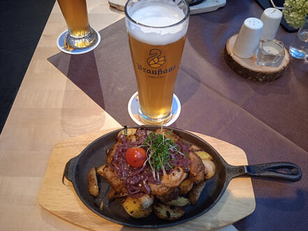 Takim zestawem nawet małym, można sobie pojeść i dostaje się do tego wybrane piwo gratis o pojemności 0,2 litra. Zestaw kosztuje 9,99 Euro za mały i 11,11 Euro duży. I co najlepsze obowiązuje od otwarcia do zamknięcia lokalu a nie tylko w godzinach lunchu.