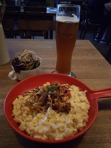 Ja wybrałem typowe danie kuchni szwabskiej, czyli Käsespätzle (zapiekanka z makaronem jajecznym z cebulą i sałatką) za 15,50 euro [na zdjęciu z piwem Weissbier].