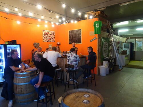 Browar mieści się on w prostokątnej poprzemysłowej hali (taka też jest okoliczna zabudowa), banery na fasadzie i płocie informują że jesteśmy w dobrym miejscu. Brama wjazdowa do hali otwarta, zaraz za nią rozstawione palety, drewniane beczki, przy nich wysokie stołki do siedzenia, takie też są przy niewielkim, również zrobionym z palet barze. Na razie obecnych kilka osób ale już wiemy, że dziś czynne. Jednak z minuty na minutę gęstniało, więc chłopak zza baru zaczął po prawej stronie pomieszczenia, przy stelażach z workami ze słodem, rozstawiać składane stoły i ławy. Widać, że cała knajpka jest improwizowana, ale to świetny pomysł by co tydzień umożliwić piwoszom wypicie piwa u źródła, a jak wiadomo w browarze smakuje najlepiej