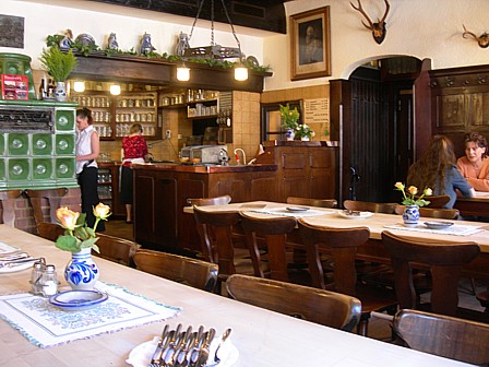 Tradycyjny też panuje klimat w tutejszej piwiarni. Wejście przez olbrzymie wrota (którymi swego czasu wytaczano na ulicę beczki z piwem) prowadzi dziś albo do ogródka piwnego na wprost, albo do sali restauracyjnej w lewo. Pierwsza sala po lewo to nieduże pomieszczenie z poustawianymi długimi drewnianymi stołami, siedzą przy nich obok siebie z jednej strony całe rodziny które wpadają tu na obiad, a z drugiej pojedynczy goście wlewający w siebie litry piwa. Drewniany wyszynk, kaflowy piec, jakieś tam poroża na ścianach tworzą fajny, luźny nastrój. Dla tych najgłośniejszych gości, mam tu na myśli wrzeszczących karcianych graczy, przeznaczona jest jeszcze jedna dodatkowa salka z boku. Trochę surowsza z wyglądu, ale czuć że lokalni piwosze właśnie tam lubią przesiadywać najbardziej. Piwiarnia pęka w szwach od lokalnych gości, turystów tu mało. Nie ma muzyki, słychać tylko szwargotanie gości i okrzyki walących ręką w stół karciarzy