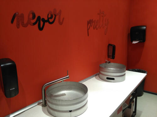 W toalecie umywalki zrobione z kegów.