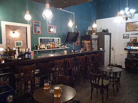 Knajpka mieści zaledwie 5 niedużych stolików, przy barze rozciągającym się na 3/4 długości sali na wysokich krzesłach może zasiąść 10 osób. Pozostałe miejsca do piwkowania są przy stoliczkach rozstawianych na zewnątrz na chodniku. Wnętrze w starym stylu, bar i meble w mocno ciemnym drewnie pasującym do ciemnej zieleni bocznych ścian, tylko szczytowe są beżowe. Na nich oprawione zdjęcia i ryciny Timişoary sprzed wieków, na półkach kilka starych odbiorników radiowych, butelki, syfony, kufle.